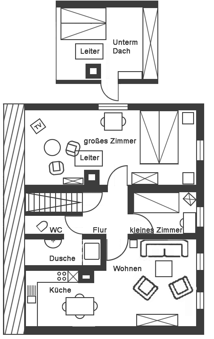 (davon 1 kleines DZ unterm Dach nur über eine